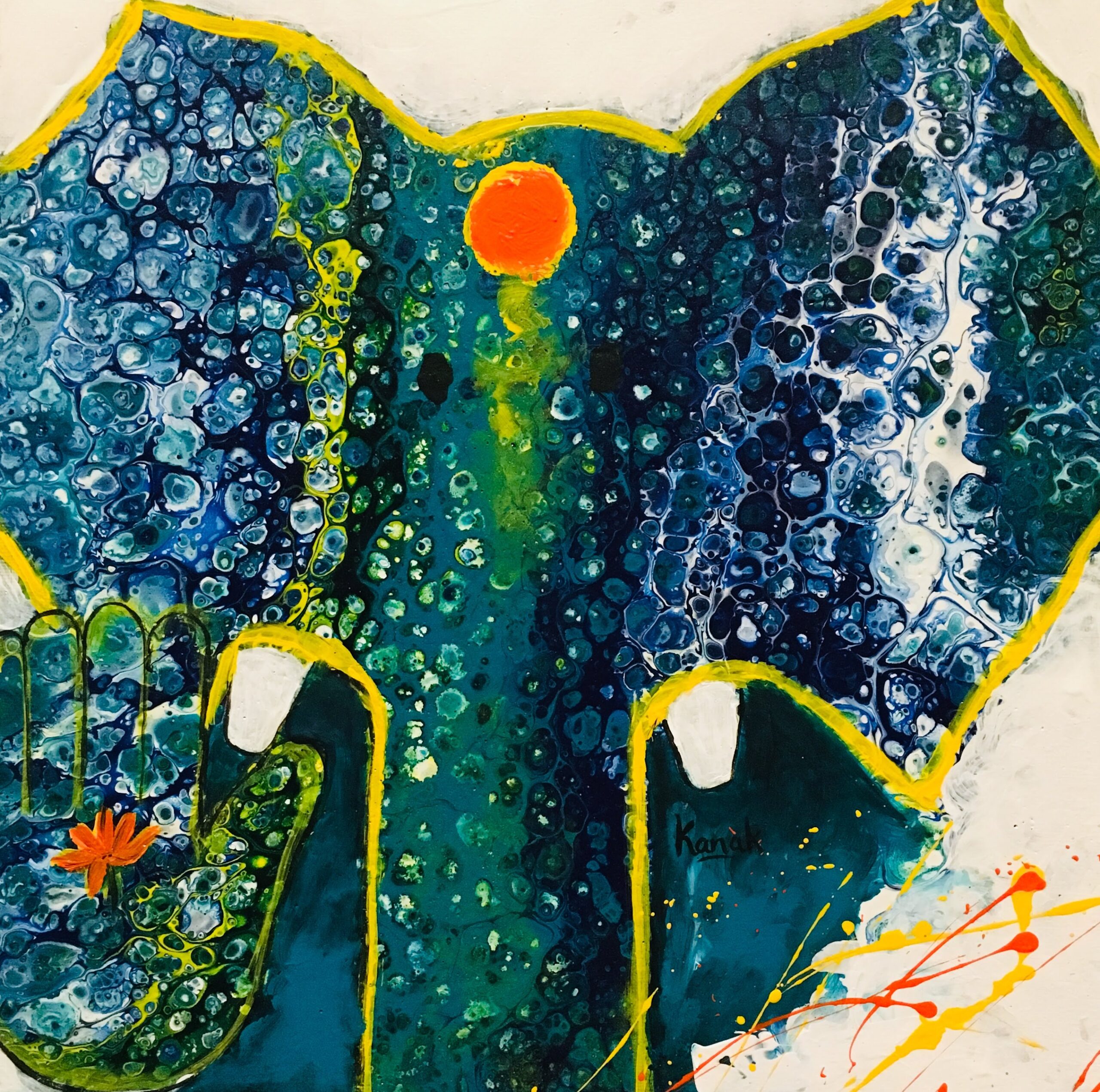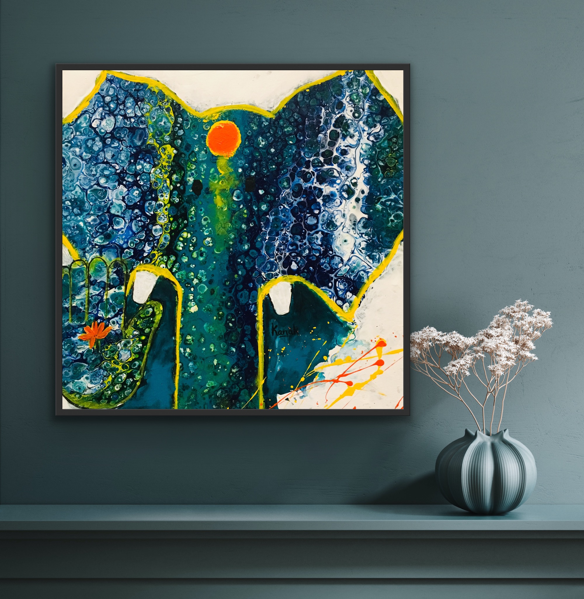 Inspired by the Elephant God Ganesha, who is very close to my heart. This painting is full of life and energy and is sure to bring positivity in any home. It is the unique piece which cannot be replicated even by me. If the size or colour doesn’t suit you, give a shout out for a similar piece to be commissioned. The best quality material has been used and it leaves the studio in a day or two.It is ready to hang as soon as it is out if it’s packaging and is framed in a black box frame. A perfect gift for house warming, Diwali or for any auspicious occasion. Ganesha is a God of good luck and prosperity.